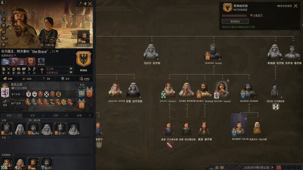 - 在考据严谨的中世纪版图上执掌家族命脉,引领宗族开枝散叶。从西元867年或1066年启程,争夺领地、头衔与封臣,打造配得上高贵血脉的恢弘版图。死亡不过是历史注脚——你的血脉将由继承人所延续,无论精心安排……还是意外横生。